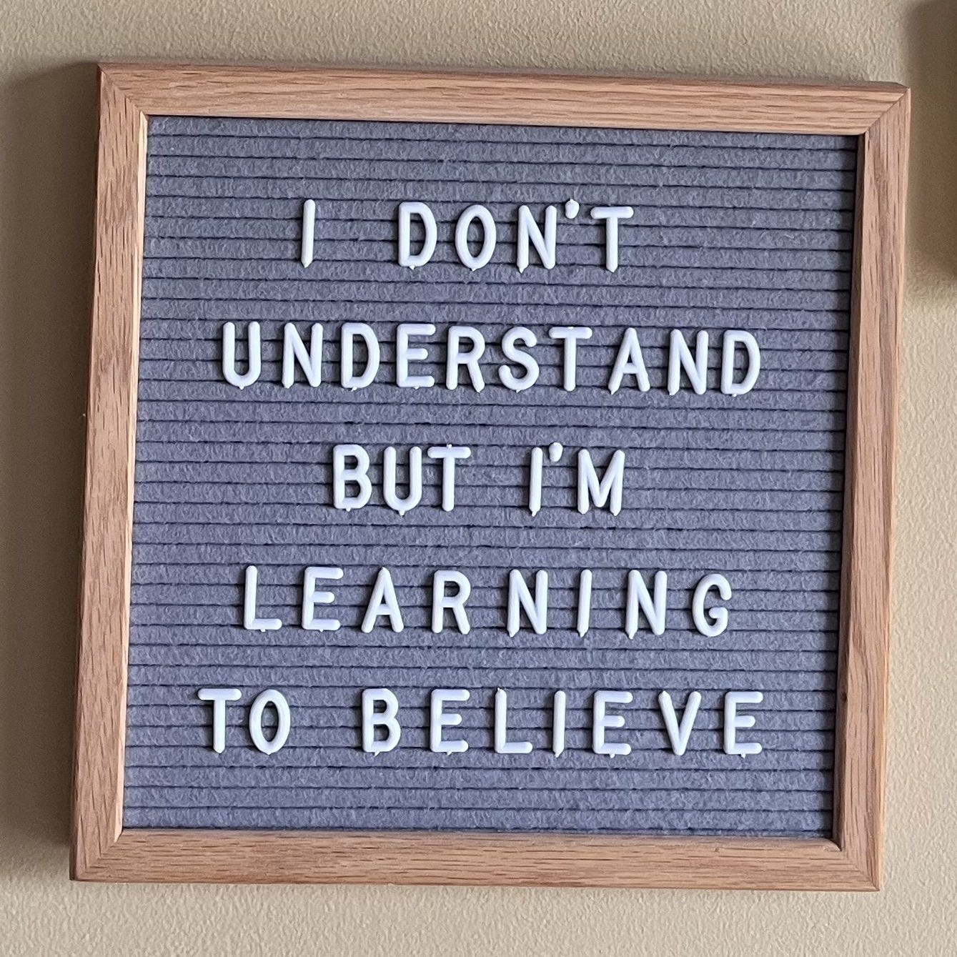 So I spelled it out in plastic letters, and it’s spent the past three years on my wall, always ready to offend my intellectual sensibilities in favor of something like faith.